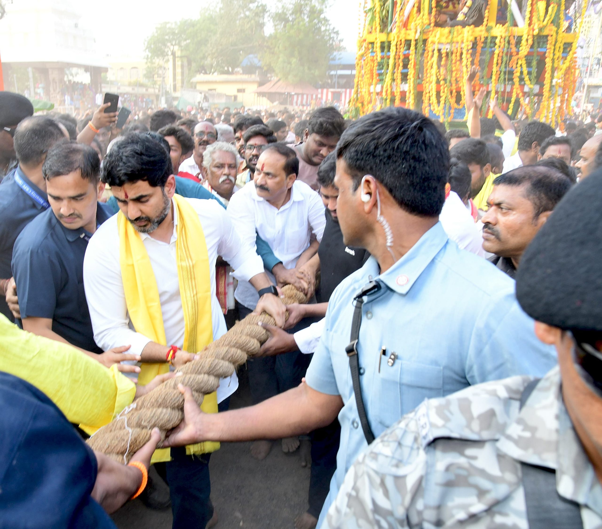 మంగళగిరి (చైతన్యరథం): శివరాత్రి వేడుకల్లో భాగంగా మంగళగిరిలోని బ్రహ్మసూత్రం గల శ్రీ గంగా భ్రమరాంబ సమేత మల్లేశ్వర స్వామి వార్ల దేవస్థానం ఆధ్వర్యంలో గురువారం నిర్వహించిన రథోత్సవంలో విద్య, ఐటీ శాఖల మంత్రి నారా లోకేష్ పాల్గొన్నారు. ముందుగా ఆలయ ప్రాంగణానికి చేరుకున్న మంత్రి లోకేష్కు నిర్వాహకులు ఘన స్వాగతం పలికారు. బాణసంచా కాల్చి తమ ఆనందాన్ని పంచుకున్నారు. అనంతరం నిర్వహించిన రథోత్సవంలో మంత్రి ఉత్సాహంగా పాల్గొన్నారు. భక్తుల శివనామ స్మరణ, అశేష జనసందోహం మధ్య రథాన్ని లాగారు. ఈ సందర్భంగా దేవస్థానం ఆధ్వర్యంలో ఏర్పాటుచేసిన సాంస్కృతిక కార్యక్రమాలు ఆకట్టుకున్నాయి. ఈ కార్యక్రమంలో స్థానిక నాయకులు, ప్రజలు పెద్దఎత్తున పాల్గొన్నారు.