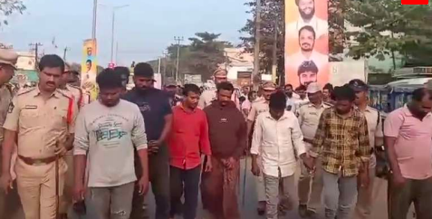 మేక తలకాయను ఎగరేస్తూ వీధుల్లో వైసీపీ కార్యకర్తలవీరంగమాడారు. రప్పారప్పా అంటూ రెచ్చగొట్టే వ్యాఖ్యలతో ఫ్లెక్సీలు ప్రదర్శించారు. ఆ తంతు మొత్తాన్ని వీడియో తీసి సోషల్ మీడియాలో ప్రచారం చేశారు. ఈ ఘటన శుక్రవారం రాత్రి జరిగింది.. దీంతో పోలీసులు శనివారం ఉదయం చోడవరం గ్రామానికి చేరుకుని ఏడుగురు వైసీపీ నేతలను అరెస్టు చేసి కస్టడీలోకి తీసుకున్నారు. నిందితుల వద్ద నుండి నాటుసారా కూడా స్వాధీనం చేసుకున్నారు. నిందితులందరినీ జ్యుడీషియల్ రిమాండ్కు పంపే నేపథ్యంలో వీధుల్లో నడిపించుకుంటూ తీసుకెళ్లారు. ఫ్లెక్సీల ముందు మేకపోతుల్ని బలిస్తే కఠిన చర్యలు తీసుకుంటామని తూర్పుగోదావరి జిల్లా ఎస్పీ నరసింహ కిషోర్ స్పష్టం చేశారు.