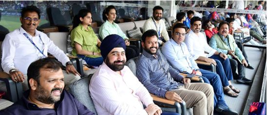 విశాఖపట్నం (చైతన్యరథం): ఏపీ విద్యా, ఐటీ, ఎలక్ట్రానిక్స్ శాఖల మంత్రి నారా లోకేష్ విశాఖలో జరుగుతున్న ఐపీఎల్ మ్యాచ్కు హాజరయ్యారు. విశాఖలోని ఏసీఏ-వీడీసీఏ స్టేడియంలో ఆదివారం జరిగిన సన్ రైజర్స్ హైదరాబాద్-ఢల్లీి క్యాపిటల్స్ జట్ల మ్యాచ్ను ఐసీసీ ఛైర్మన్ జైషాతో కలిసి మంత్రి లోకేష్ వీక్షించారు. అంతకుముందు విశాఖ క్రికెట్ స్టేడియానికి చేరుకున్న మంత్రి లోకేష్, ఐసీసీ ఛైర్మన్ జై షా, బీసీసీఐ ప్రెసిడెంట్ రోజర్ బిన్నీలకు ఆంధ్రా క్రికెట్ అసోసియేషన్ అధ్యక్షుడు కేశినేని చిన్ని, ఇతర సభ్యులు ఘనస్వాగతం పలికారు. మంత్రి లోకేష్ను ఏసీఏ అధ్యక్షుడు కేశినేని చిన్ని శాలువాతో సత్కరించి మొమెంటో బహూకరించారు.