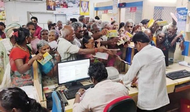 పింఛన్ల  కోసం బ్యాంకుల వద్ద బారులు తీరిన వృద్దులు, దివ్యాంగులు