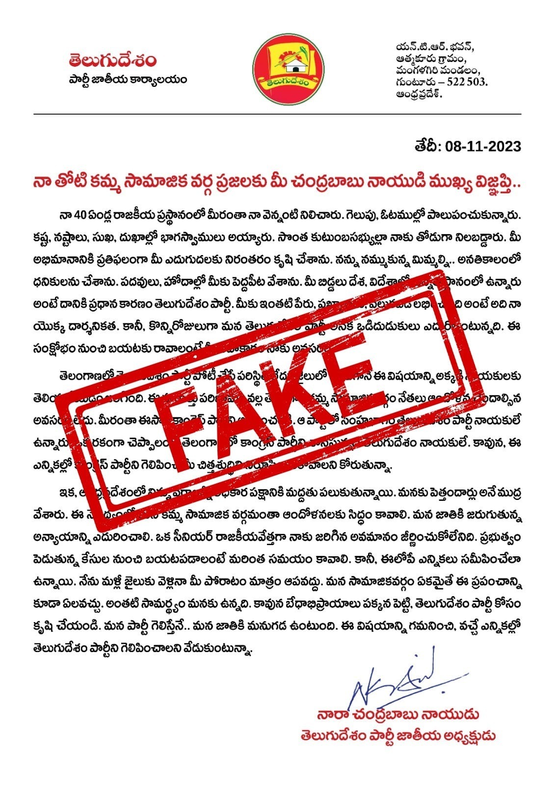 కాంగ్రెస్కు మద్దతు ఇవ్వాలని కమ్మ సామాజిక వర్గానికి చంద్రబాబు లేఖ రాసినట్లు ఒక ఫేక్ లేఖను సోషల్ మీడియాలో సర్క్యులేట్ చేస్తున్నారని దాన్ని నమ్మవద్దని అచ్చెన్నాయుడు కోరారు. ఈ లేఖలో చంద్రబాబు సంతకం సైతం ఫోర్జరీ చేశారని, దీనిపై పోలీసులకు ఫిర్యాదు చేస్తామని చెప్పారు. పోలీసుశాఖకు చిత్తశుద్ది ఉంటే ప్రతిపక్ష పార్టీలు, నేతలపై అసత్య ప్రచారాలకు పాల్పడు తున్న వారిపై వెంటనే చర్యలు తీసుకోవాలని అచ్చెన్నాయుడు డిమాండ్ చేశారు.