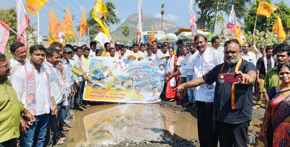 అమరావతి:రాష్ట్రంలో రోడ్ల దుస్థితికి నిరసనగా టీడీపీ-జనసేన ఆధ్వర్యంలో రెండు రోజులపాటు ‘‘గుంతల ఆంధ్రప్రదేశ్కు దారేది’’కార్యక్రమానికి శ్రీకారం చుట్టారు.మొదటిరోజు శనివారం రాష్ట్రవ్యాప్తంగా టీడీపీ-జనసేన నాయకులు, కార్యకర్తలు ఉమ్మడిగా ఆందోళనలు చేశారు. గుంతల రోడ్లపై ప్రయాణించలేక ప్రజలు ఎంత ఇబ్బందులు పడుతున్నారో కళ్ళకు కట్టినట్లు వైకాపా ప్రభుత్వా నికి చూపారు. పలుచోట్ల ధర్నాలు, పాదయాత్రలు, ర్యాలీ కార్యక్రమాలు నిర్వ హించి నిరసన వ్యక్తంచేశారు. రాష్ట్రంలో రోడ్లు దారుణంగా తయారై గుంతలు పడి ప్రజలు అవస్థలు పడుతున్నారని..అయినా పాలకులకు ఇవేమి పట్టించు కోకుండా..ఏమీపట్టనట్లు వ్యవహరిస్తున్నారని నాయకులు ధ్వజమెత్తారు.ఇత రరాష్ట్రాలవారు ఆంధ్రప్రదేశ్కు రావాలంటేనే భయపడుతున్నారు. నవ్యాంధ్ర ప్రదేశ్ను సమస్యల ఆంధ్రప్రదేశ్గా జగన్రెడ్డిమార్చాడని ఆందోళనలు చేశారు.