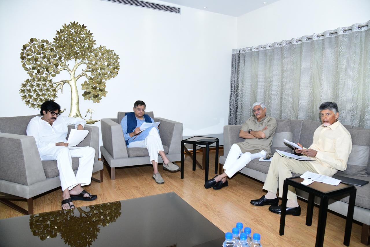 ఉండవల్లిలోని టీడీపీ అధినేత చంద్రబాబు నివాసంలో మూడు పార్టీల కీలక భేటీ జరిగింది. సోమవారం మధ్యాహ్నం 12 గంటలనుంచి దాదాపు 8 గంటలపాటు జరిగిన ఈ సమావేశంలో సీట్ల సర్దుబాటుపై విస్తృతంగా చర్చలు జరిపారు. చంద్రబాబు, కేంద్రమంత్రి గజేంద్రసింగ్ షెకావత్, భాజపా జాతీయ నేత బైజయంత్ పాండా జనసేన అధినేత పవన్కల్యాణ్, ఈ సమావేశంలో సీట్ల లెక్కలపై ఏకాభిప్రాయానికి వచ్చారు. చర్చల్లో తెదేపా రాష్ట్ర అధ్యక్షుడు అచ్చెన్నాయుడు, ఎమ్మెల్యేలు గొట్టిపాటి రవికుమార్, అనగాని సత్యప్రసాద్, జనసేన పీఏసీ ఛైర్మన్ నాదెండ్ల మనోహర్, తదితరులు పాల్గొన్నారు. కాగా అనంతపురంలో మలివిడత శంఖారావం సభలు ముగించుకుని వచ్చిన టీడీపీ జాతీయ ప్రధాన కార్యదర్శి నారా లోకేశ్ కూడా ఈ చర్చల్లో పాల్గొన్నారు. ఏ పార్టీ ఎక్కడి నుంచి పోటీ చేయాలనేదానిపై స్పష్టత కోసం ఈ సమావేశంలో చర్చించారు. అదే విధంగా ఎన్నికల్లో అధికారాన్ని అడ్డం పెట్టుకుని వైకాపా ఏ విధంగా లబ్టిపొందే ప్రయత్నం చేస్తుందనే అంశంపైనా నేతలు కీలకంగా చర్చించినట్లు సమాచారం. రాష్ట్రంలోని జగన్రెడ్డి ప్రభుత్వం సాగిస్తున్న అరాచకాలకు పోలీస్, రెవెన్యూ యంత్రాంగాలను అడ్డం పెట్టుకుంటున్న తీరుపైనా, సచివాలయ వ్యవస్థ దుర్వినియోగం అంశంపైనా లోతుగా చర్చలు జరిపారు.