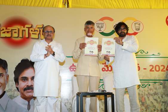 రాష్ట్రంలో త్వరలో జరగనునున్న ఎన్నికల్లో కూటమిగా పోటీ చేస్తున్న తెలుగుదేశం, జనసేన, భారతీయ జనతాపార్టీ తరపున ఉమ్మడి మేనిఫెస్టో మూడు పార్టీల నేతల సమక్షంలో మంగళవారం సాయంత్రం విడుదలైంది. తెదేపా అధినేత నారా చంద్రబాబునాయుడు, జనసేన అధినేత పవన్ కల్యాణ్, బీజేపీ అగ్ర నేత సిద్ధార్థనాథ్్ సింగ్ ల సమక్షంలో ఉమ్మడి మేనిఫెస్టోను వెల్లడిరచారు.