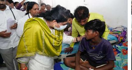 సాలూరు (చైతన్యరథం): అస్వస్థతకు గురైన గురుకుల విద్యార్థులకు మెరుగైన వైద్యసేవలు అందించాలని అధికారులను గిరిజన, స్త్రీ,శిశు సంక్షేమశాఖల మంత్రి గుమ్మిడి సంధ్యారాణి ఆదేశించారు. పార్వతీపురం మన్యం జిల్లా సాలూరు నియోజకవర్గంలో వివిధ హాస్టళ్ల విద్యార్థులు అనారోగ్యానికి గురికావటంతో మంత్రి శుక్రవారం స్వయంగా వెళ్లి పరిస్థితులను తెలుసుకున్నారు. ఆసుపత్రి వెళ్లి చికిత్స పొందుతున్న విద్యార్థుల పరిస్థితిని అడిగి తెలుసుకున్నారు. విద్యార్థుల పరిస్థితి మెరుగ్గానే ఉందని అధికారులు తెలిపారు. ప్రస్తుతం అందరి ఆరోగ్య పరిస్థితి నిలకడగానే ఉందన్నారు. విద్యార్థులు పూర్తిగా కోలుకునే వరకూ మెరుగైన వైద్యం కొనసాగించాలని మంత్రి ఆదేశించారు. విద్యార్థుల పరిస్థితి తనకు ఎప్పటికప్పుడు నివేదించాలన్నారు. చిన్నారులు డిశ్చార్జ్ అయ్యేంత వరకు జాగ్రత్తగా పర్యవేక్షించాలని మంత్రి స్పష్టం చేశారు. పీహెచ్సీ డాక్టర్ల సమ్మె కారణంగా వివిధ ప్రాంతాల నుండి 6 హాస్టళ్ల విద్యార్థులను సాలూరు సీహెచ్సీలో చేర్పించారు. ఆ ఆరు హాస్టళ్లలో 4 గిరిజన, ఒక సోషల్ వెల్ఫేర్, ఒక కేజీబీవీ హాస్టల్ ఉన్నాయి. విద్యార్థుల అనారోగ్య వార్త తెలుసుకున్న వెంటనే సాలూరు సీహెచ్సీకి చేరుకున్న మంత్రి సంధ్యారాణి వారి యోగక్షేమాలు అడిగి తెలుసుకున్నారు.