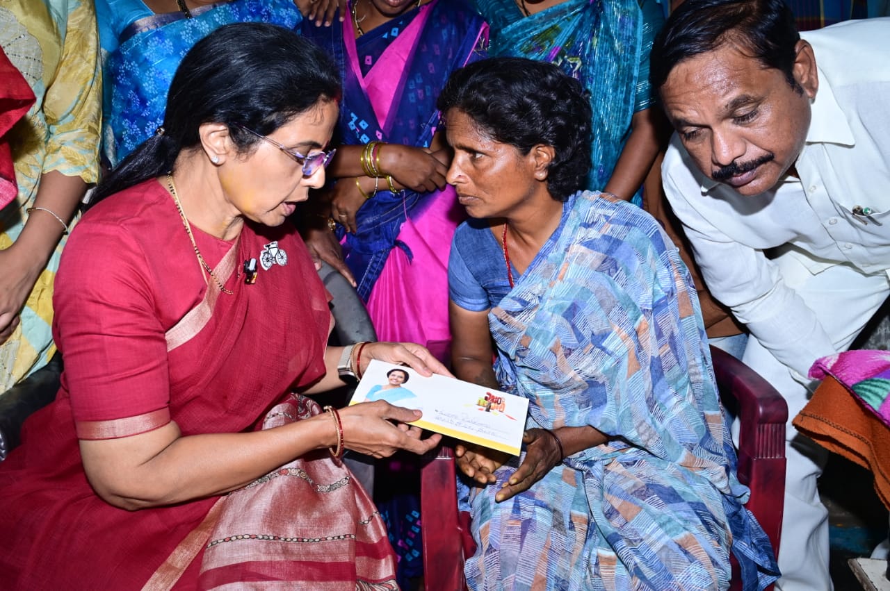 పత్తికొండ (చైతన్యరథం): టీడీపీ అధినేత చంద్రబాబు అక్రమ అరెస్టు సమయంలో మనస్తాపంతో గుండెపోటుకు గురై చనిపోయి న కార్యకర్త పిల్లలకు అండగా ఉంటానని భువనమ్మ భరోసా ఇచ్చా రు. కర్నూలు జిల్లా పత్తికొండ నియో జకవర్గం, కృష్ణగిరి మండలం, ఎర్రగుడి గ్రామంలో పార్టీ కార్యకర్త పింజరి సుభాన్ కుటుంబాన్ని గురవారం భువనమ్మ పరామర్శించారు. సుభాన్ పిల్లలను చూసి చలించిపోయారు. పిల్లలు చిన్న వయస్సులో ఉన్న సమయం లో సుభాన్ మృతికుటుంబానికి తీరని లోటుగా పరిగణించిన భువనమ్మ వారికి అన్ని విధాలా తోడుంటానని హామీఇచ్చారు. సుభాన్ కుమార్తె ఆస్మకు కంటి చూపులేని విషయం తెలుసుకుని తగిన చికిత్స అందించే బాధ్యత తీసుకున్నారు.
