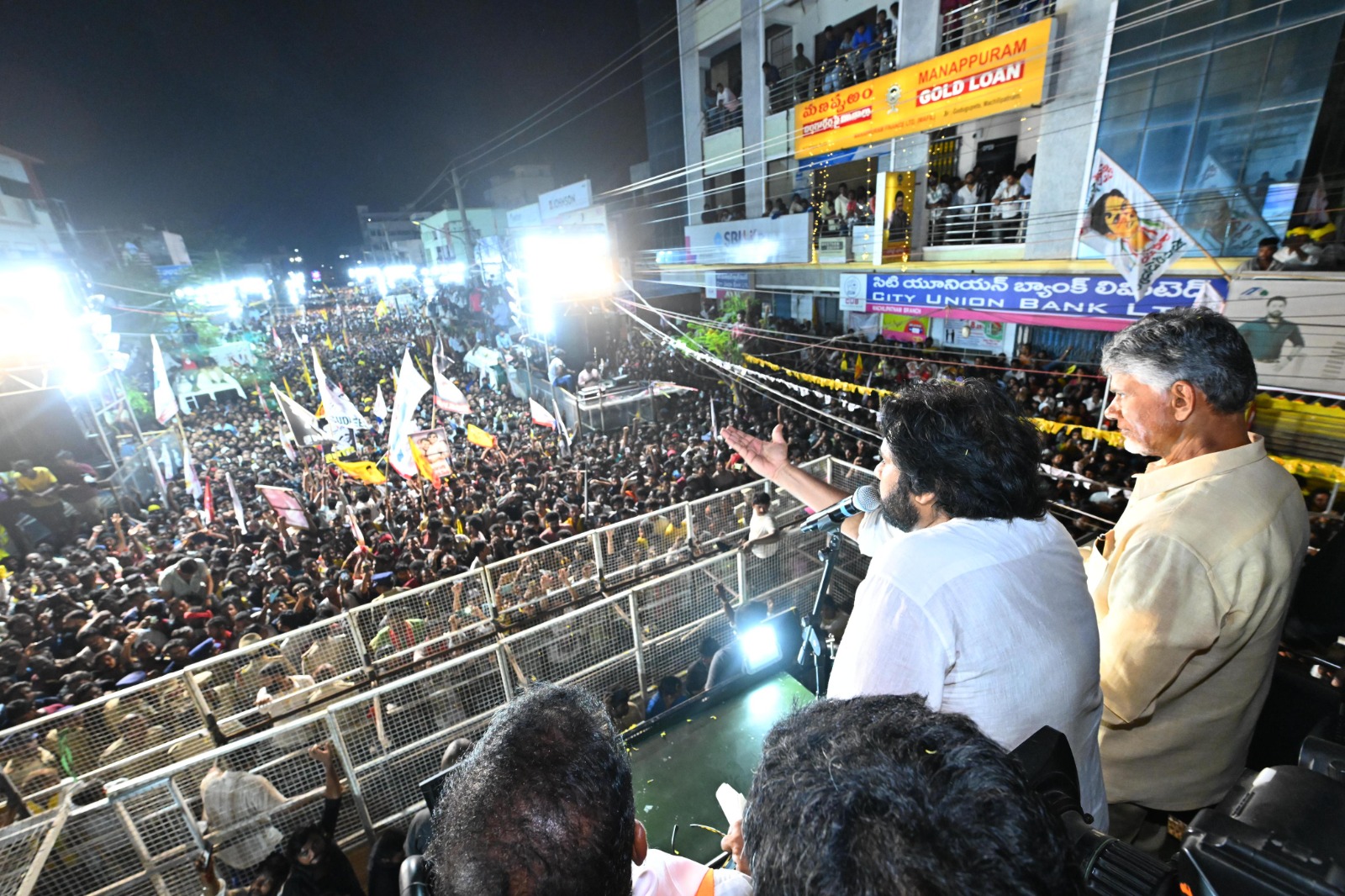 రాష్ట్రంలో ఎన్డీయే ప్రభుత్వం అధికారంలోకి రాగానే బందర్కు పూర్వవైభవం తీసుకువస్తామని చంద్రబాబు, పవన్ కళ్యాణ్ చెప్పారు. అధికారంలోకి వచ్చాక ఆక్వా రంగానికి విద్యుత్ సబ్సిడి ఇచ్చి ఆదుకుంటామని, 217 జీవో రద్దు చేసి మత్స్యకారులను ఆదుకుంటామని, వలలు, బోట్ల మీద మెరుగైన సబ్సిడి ఇస్తామని, మచిలీపట్నం పోర్టు పూర్తి చేసి బందరుకు పూర్వ వైభవం తెస్తామని హామీ ఇచ్చారు. అన్ని అభివృద్ధి పనులు పూర్తి చేసే బాధ్యత మాది.. మమ్మల్ని ఆశీర్వదించే బాధ్యత మీది అని చంద్రబాబు, పవన్ కళ్యాణ్ అన్నారు.