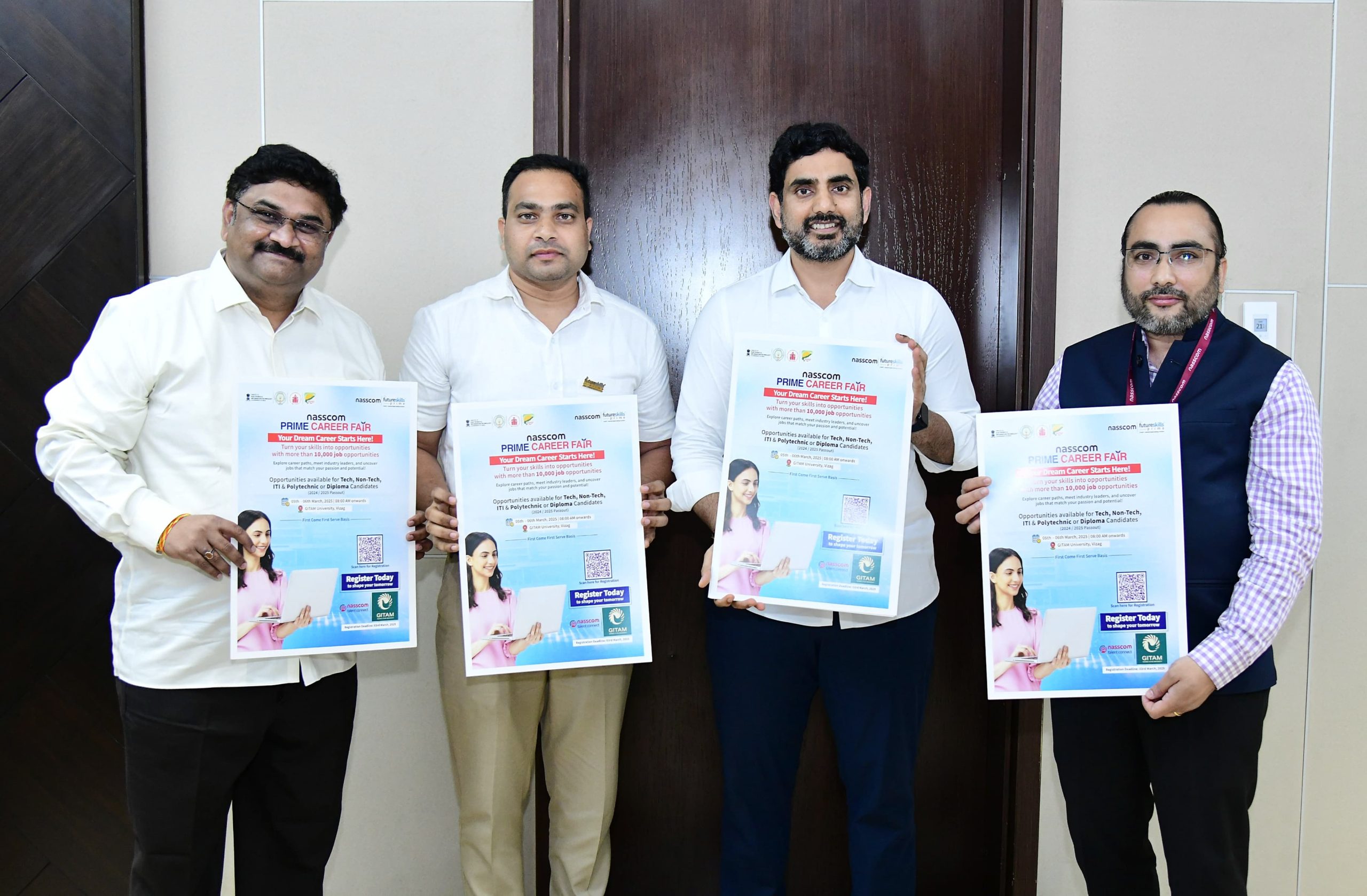అమరావతి (చైతన్యరథం): విశాఖపట్నం గీతం యూనివర్సిటీలో మార్చి 5,6 తేదీల్లో నాస్కామ్, ఏపీ ప్రభుత్వం సంయుక్తంగా కెరీర్ ఫెయిర్ నిర్వహించనున్నాయి. ఈ కెరీర్ ఫెయిర్లో 49 ఐటీ, ఐటీఈఎస్ కంపెనీల్లో యువతీ, యువకులకు సుమారు 10వేల ఉద్యోగ అవకాశాలు కల్పించనున్నారు. ఇందుకు సంబంధించిన పోస్టర్ను మంగళగిరిలోని పార్టీ కేంద్ర కార్యాలయంలో విద్య, ఐటీ శాఖల మంత్రి నారా లోకేష్ గురువారం ఆవిష్కరించారు. 2024, 2025 ఏడాదుల్లో ఉత్తీర్ణులైన నిరుద్యోగ యువతీ, యువత రిజిస్ట్రేషన్ చేసుకుని ఈ అవకాశాన్ని సద్వినియోగం చేసుకోవాలని మంత్రి పిలుపునిచ్చారు. ఈ పోస్టర్ ఆవిష్కరణ కార్యక్రమంలో నాస్కామ్ చీఫ్ ఆపరేటింగ్ ఆఫీసర్ డాక్టర్ ఉప్మిత్ సింగ్, నేషనల్ లీడ్ ఉదయ్ శంకర్, ఏపీ లీడ్ ప్రవీణ్ కుమార్, సునీల్, తదితరులు పాల్గొన్నారు.