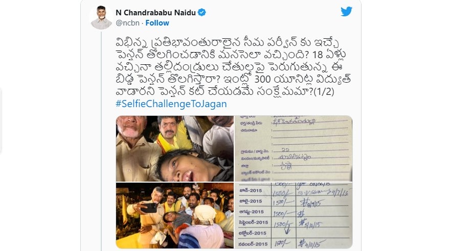 18 ఏళ్లు వచ్చినా వైకల్యం కారణంగా తల్లిదండ్రులు చేతులపైనే పెరుగుతున్న ఈ బిడ్డ పెన్షన్‌ తొలగిస్తారా? ఇంట్లో 300 యూనిట్ల విద్యుత్‌ వాడారని పెన్షన్‌ కట్‌ చేయడమే సంక్షేమమా? పెన్షన్‌ కు నాడు అర్హురాలు, నేడు అనర్హురాలు ఎలా అయ్యింది?90శాతం వైకల్యం ఉన్న అమెకు నిబంధనల పేరుతో పెన్షన్‌ తొలగించడమే మీ మానవత్వమా? అని నిగ్గదీశారు. వాస్తవంగా చెప్పాలి అంటే వైకల్యంతో ఉంది ఆమె కాదు…. మీరు మీ ప్రభుత్వం అంటూ చంద్రబాబు నాయుడు సెల్ఫీ ఛాలెంజ్‌ చేశారు. సంక్షేమ పథకాల్లో ఆంక్షలతో కోతలపై సమాధానం చెప్పాలి అంటూ సీఎం జగన్‌ కు చంద్రబాబు ట్వీట్‌ చేశారు.