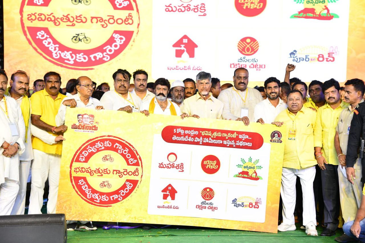 రాజమహేంద్రవరం మహానాడు వేదికగా తెలుగుదేశం పార్టీ అధినేత నారా చంద్రబాబు నాయుడు ఎన్నికల శంఖారావం పూరించారు. ఎన్టీఆర్ శతజయంతి వేడుకలతో పాటు ఆదివారం జరిగిన తెలుగుదేశం పార్టీ మహానాడులో లక్షలాదిమంది ప్రజానీకాన్ని ఉద్దేశించి చంద్రబాబు ఉద్వేగభరిత ప్రసంగం చేశారు. మహానాడు వేదికగా తెలుగుదేశం పార్టీ అధికారంలోకి రాగానే చేపట్టనున్న ఆరు పధకాలపై సంచలన ప్రకటన చేశారు. సామాన్య, పేద, మద్యతరగతి ప్రజల జీవనగమనంలో పెనుమార్పులకు నాంది పలికే విధంగా చంద్రబాబు తొలి దశలో ఆరు పధకాలను ప్రకటించారు.