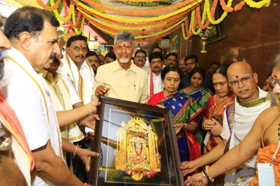 విజయవాడ: రాష్ట్ర ముఖ్యమంత్రి నారా చంద్రబాబు నాయుడు దంపతులు ఇంద్రకీలాద్రిపై కొలువైఉన్న దుర్గమ్మవారిని దర్శించుకున్నారు. సీఎంగా ప్రమాణ స్వీకారం చేశాక తొలిసారి గురువారం ఆలయానికి విచ్చేసిన ముఖ్యమంత్రికి ఆలయ పండితులు, అధికారులు వేద మంత్రాలు, మంగళ వాయిద్యాలు నడుమ పూర్ణకుంభ స్వాగతం పలికారు. అనంతరం సీఎం దంపతులు అమ్మవారికి ప్రత్యేక పూజలు చేశారు. అమ్మవారికి పట్టు వస్త్రాలు సమర్పించారు. అమ్మవారి దర్శనానంతరం వేద పండితులు చంద్రబాబు దంపతులకు వేద ఆశీర్వచనాన్ని అందించారు. ఈ సందర్భంగా సతీమణి భువనేశ్వరి మెడలో చంద్రబాబు పూలమాల వేశారు. ఆశీర్వచనం అనంతరం లడ్డు ప్రసాదాన్ని, అమ్మవారి చిత్రపటాన్ని చంద్రబాబు దంపతులకు ఆలయ ఈవో రామారావు అందజేశారు. కాగా చంద్రబాబు వెంట టీడీపీ కార్యకర్తలు, నాయకులు అభిమానులు ఆలయానికి వచ్చారు. కాగా దర్శనం అనంతరం చంద్రబాబు ఇంద్రకీలాద్రి నుంచి ఉండవల్లి నివాసానికి బయలుదేరారు.