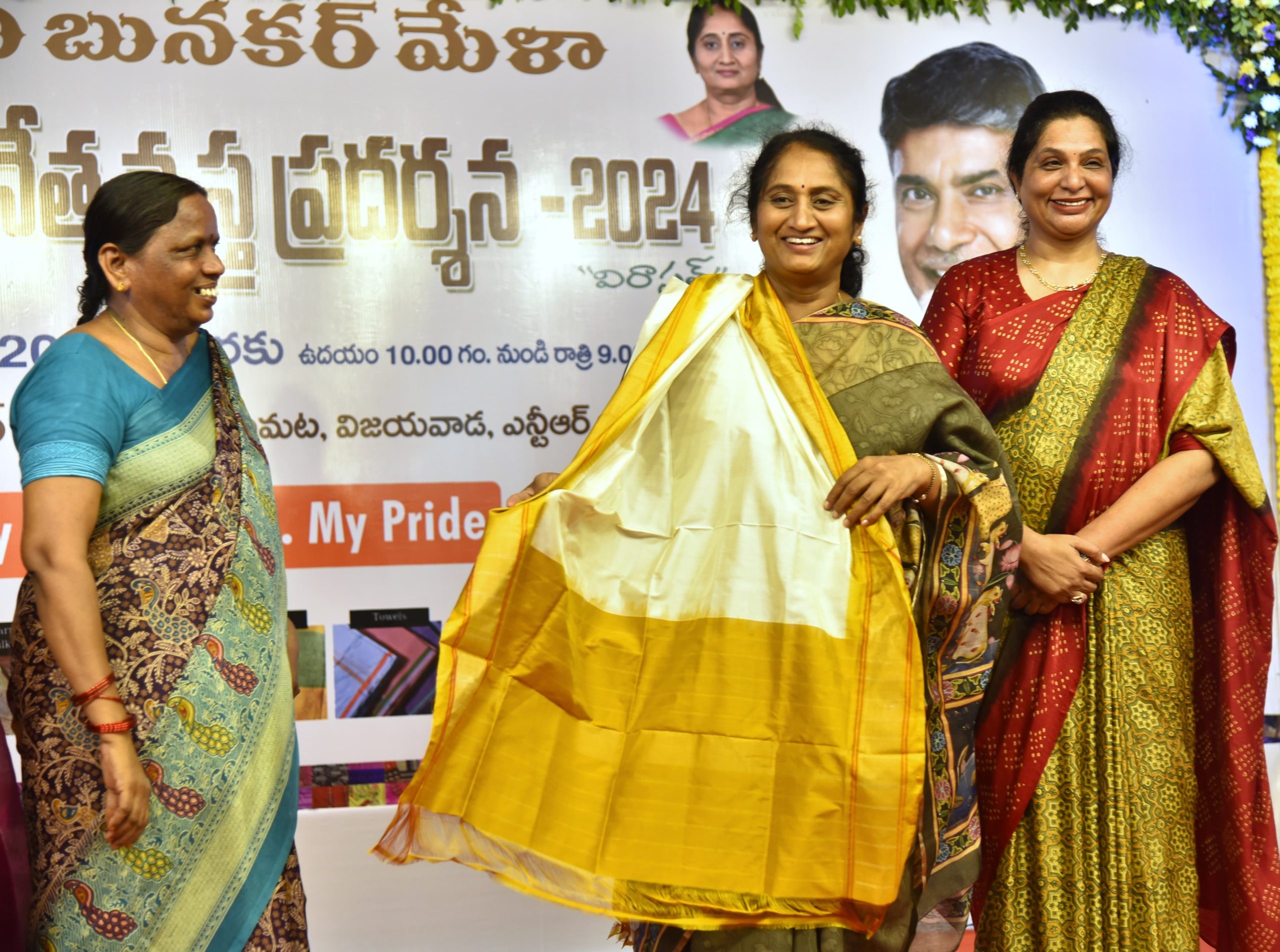 విజయవాడ(చైతన్యరథం): విజయవాడలో 14 రోజుల పాటు నిర్వహించిన గాంధీ బునకర్ చేనేత మేళా విజయవంతమైందని, ప్రజల నుంచి వచ్చిన స్పందనను దృష్టిలో పెట్టుకొని రాష్ట్రంలో మిగిలిన జిల్లాలోనూ చేనేత వస్త్ర ప్రదర్శనలు నిర్వహించనున్నట్లు రాష్ట్ర బీసీ సంక్షేమ, చేనేత, జౌళి శాఖ మంత్రి ఎస్.సవిత తెలిపారు. ఈ నెల ఏడో తేదీ నుంచి నగరంలోని మారిస్ స్టెల్లా కాలేజీ ఆడిటోరియంలో నిర్వహిస్తున్న గాంధీ బునకర్ జాతీయ చేనేత వస్త్ర ప్రదర్శన మంగళవారం ముగిసింది. ఈ ముగింపు కార్యక్రమానికి మంత్రి సవిత ముఖ్య అతిథిగా హాజరయ్యారు. ఈ సందర్భంగా నిర్వహించిన విలేకరుల సమావేశంలో మంత్రి మాట్లాడుతూ, 14 రోజుల పాటు నిర్వహించిన చేనేత వస్త్ర మేళా విజయవంతం కావడంపై ఆనందం వ్యక్తం చేశారు. దళారుల ప్రమేయం లేకుండా నేరుగా నేతన్నలకే ఆర్థిక మేలు కలగజేయాలన్న ఉద్దేశంతో ఈ ప్రదర్శన నిర్వహించామన్నారు. తమ లక్ష్యం నెరవేరిందన్నారు. 14 రోజుల పాటు రోజుకు 15 లక్షల నుంచి 20 లక్షల రూపాయల మేర అమ్మకాలు జరిగాయన్నారు. మొత్తంగా రూ.20 కోట్ల అమ్మకాలు జరగడం ఆనందంగా ఉందన్నారు.