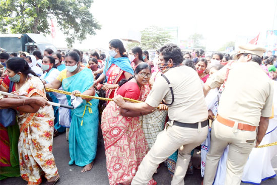 అమరావతి: తమ సమస్యలను పరిష్క రించాలని డిమాండ్ చేస్తూ ఆశా వర్కర్లు చేపట్టిన చలో విజయవాడ కార్యక్రమంపై రాష్ట్ర ప్రభుత్వం ఉక్కుపాదం మోపింది. రాష్ట్రంలోని వివిధ ప్రాంతాలనుండి విజయ వాడ బయలుదేరిన ఆశా వర్కర్లను ఎక్కడి క్కడ పోలీసులు అరెస్ట్చేశారు. ఎదో విధం గా విజయవాడ చేరుకున్న ఆశావర్కర్ల పట్ల జగన్ ప్రభుత్వం దుర్మార్గంగా వ్యవహరిం చింది. రాష్ట్రవ్యాప్తంగా అన్ని జిల్లాల నుంచి విజయవాడ, మంగళగిరి తదితర ప్రాంతా లకు చేరుకున్న వందలాది మంది ఆశా వర్కర్లపై విచక్షణా రహితంగా లాఠీచార్జి చేశారు. వందలాది మంది అశా వర్కర్లను పోలీసులు అరెస్టు చేశారు. దౌర్జన్యంగా రోడ్లపై ఈడ్చుకుంటూ వాహనాల్లో కుక్కేసి పోలీస్స్టేషన్లకు తరలించారు.ఈ క్రమంలో తోపులాట చోటుచేసుకుంది. పలువురు ఆశా వర్కర్లకు గాయాలయ్యాయి. తాడేపల్లి సమీపంలోని వడ్డేశ్వరం సుందరయ్య విజ్ఞా నకేంద్రంలో సుమారు 100 మందిని పోలీ సులు నిర్బంధించారు.వీరంతా గేట్లు దూకి, చెన్నై కోల్కతా జాతీయ రహదారిపైకి చేరు కుని కొంతపేపు రాస్తారోకో చేశారు. అక్క డికి చేరుకున్న పోలీసులు వారిపై తిరిగి లాఠీచార్జి చేశారు.వారిని చెదరగొట్టి దొరికి క వాళ్లను దొరికినట్లుగా అరెస్ట్ చేసి, వాహ నాల్లోకి తేసేసి అక్కడి నుండి తీసుకెళ్లారు. కాజా టోలేట్ వద్ద 15 మందిని అరెస్ట్ చేశారు. పోలీసుల వైఖరిని ఆశావర్కర్లతో పాటు సీఐటీయూ నేతలు తీవ్రంగా ఖండిర చారు. తమ సమస్యలు పరిష్కరించకపోతే ఆందోళన తీవ్రతరం చేస్తామని రాష్ట్ర ప్రభుత్వాన్ని హెచ్చరించారు. కనీస వేతనం అమలు, పనిభారం తగ్గింపు, రిటైర్మెంట్ బెనిఫిట్స్ తదితర అంశాలపై వారు గతకొంతకాలంగా ఆందోళన కొనసాగిస్తున్నారు.