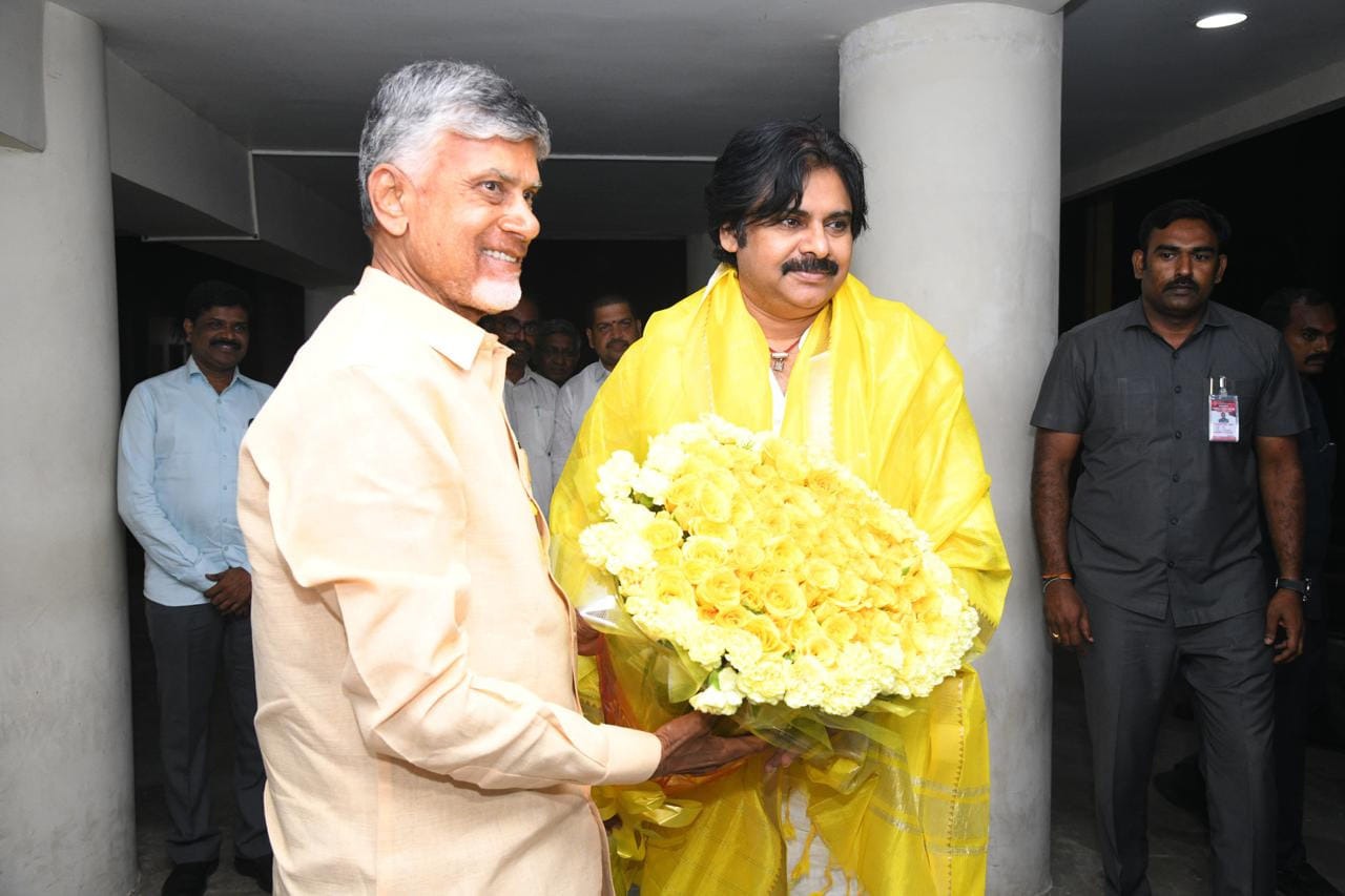 తెలుగు దేశం పార్టీ అధినేత చంద్రబాబు నాయుడును జనసేనాని పవన్‌ కల్యాణ్‌, పిఎసి ఛైర్మన్‌ నాదెండ్ల మనోహర్‌ శనివారం రాత్రి ఉండవల్లి నివాసంలో భేటీ అయ్యారు. తమ ఇంటికి వచ్చిన అతిథులకు చంద్రబాబు, లోకేష్‌ అత్మీయ స్వాగతం పలికారు. ఇప్పటికే టీడీపీ ప్రజలకు ఇచ్చిన సూపర్‌ సిక్స్‌ హామీలతో పాటు జనసేన ప్రతిపాదించిన మరో ఆరు హామీలను మేనిఫెస్టోలో పొందుపరిచేందుకు ఇరుపార్టీల అధినేతలు ప్రాధమికంగా నిర్ణయానికి వచ్చారు.