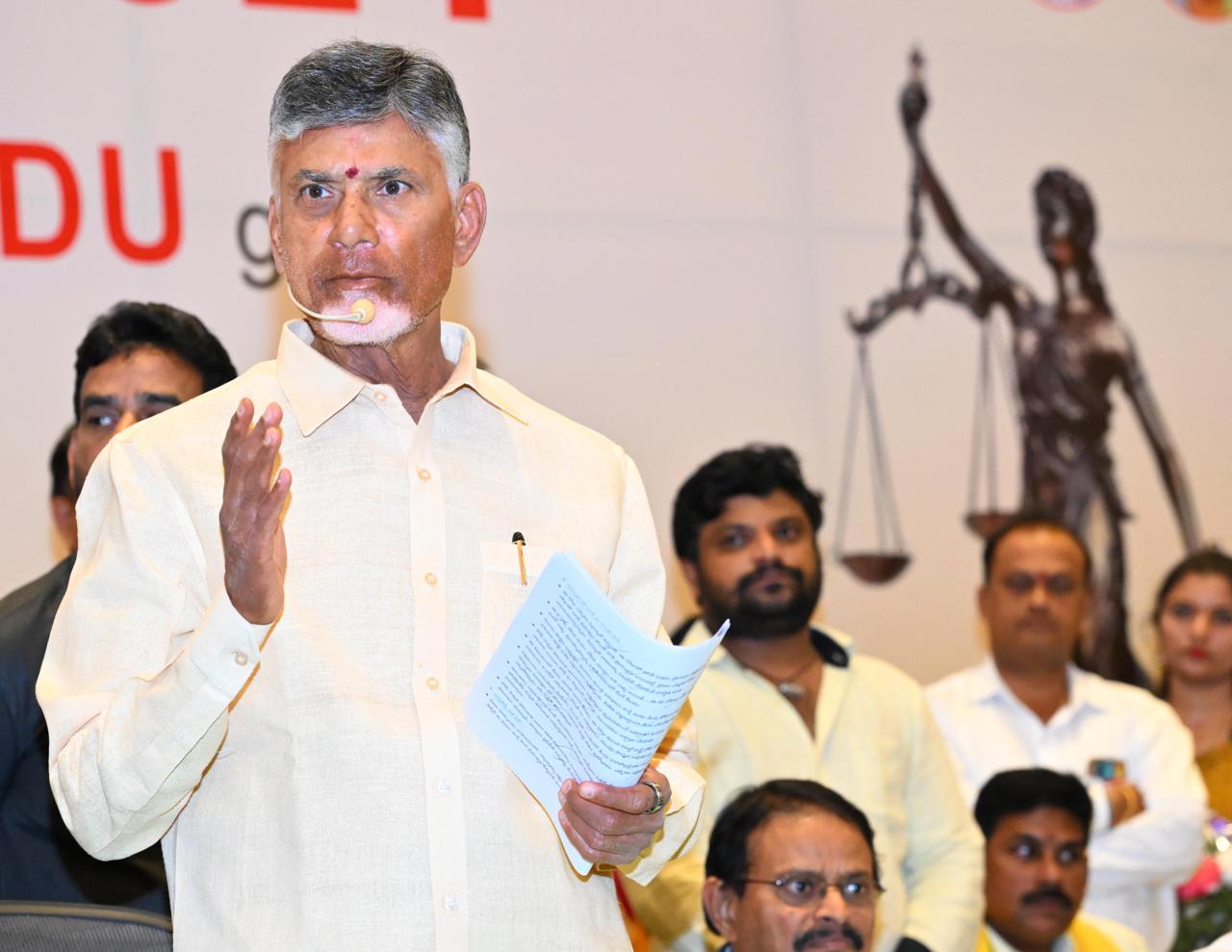 నా నామినేషన్ను కార్యకర్తలు, న్యాయవాదులే వేసేవారు. కేవలం డిక్లరేషన్ పత్రంపైనే సంతకం చేసేవాడిని. కానీ నేడు నాపై ఎన్నికేసులున్నాయో ముందుగానే డీజీపీని, అధికారులను లేఖల ద్వారా అడిగే పరిస్థితి. అడగకపోతే ఎప్పుడు దొంగ కేసులు పెట్టారో తెలియదు. నామినేషన్ వేయాలనుకునే ప్రతి అభ్యర్థి తనపై ఎన్ని కేసులు ఎన్నాయో చెప్పండి అని అడుక్కునే పరిస్థితి రాష్ట్రంలో ఉంది. రాజ్యాంగంలో శాసన, కార్యనిర్వహక, మీడియా ప్రధానమైనవి. ఇవి గాడి తప్పితే మళ్లీ గాడిలో పెట్టేది న్యాయ వ్యవస్థే. న్యాయ వ్యవస్థ లేకుండా మనం ఇక్కడ ఉండేవాళ్లం కాదు. నాతో పాటు మా లాయర్లు కూడా నిద్రలేని రాత్రులు గడిపారు. ప్రతి శుక్రవారం రాష్ట్రంలో ప్రొక్లెయిన్లు వస్తాయి. ఇల్లీగల్ కస్టడీకి కూడా తీసుకున్నారు’ అని చంద్రబాబు తీవ్రస్వరంగా అన్నారు.
