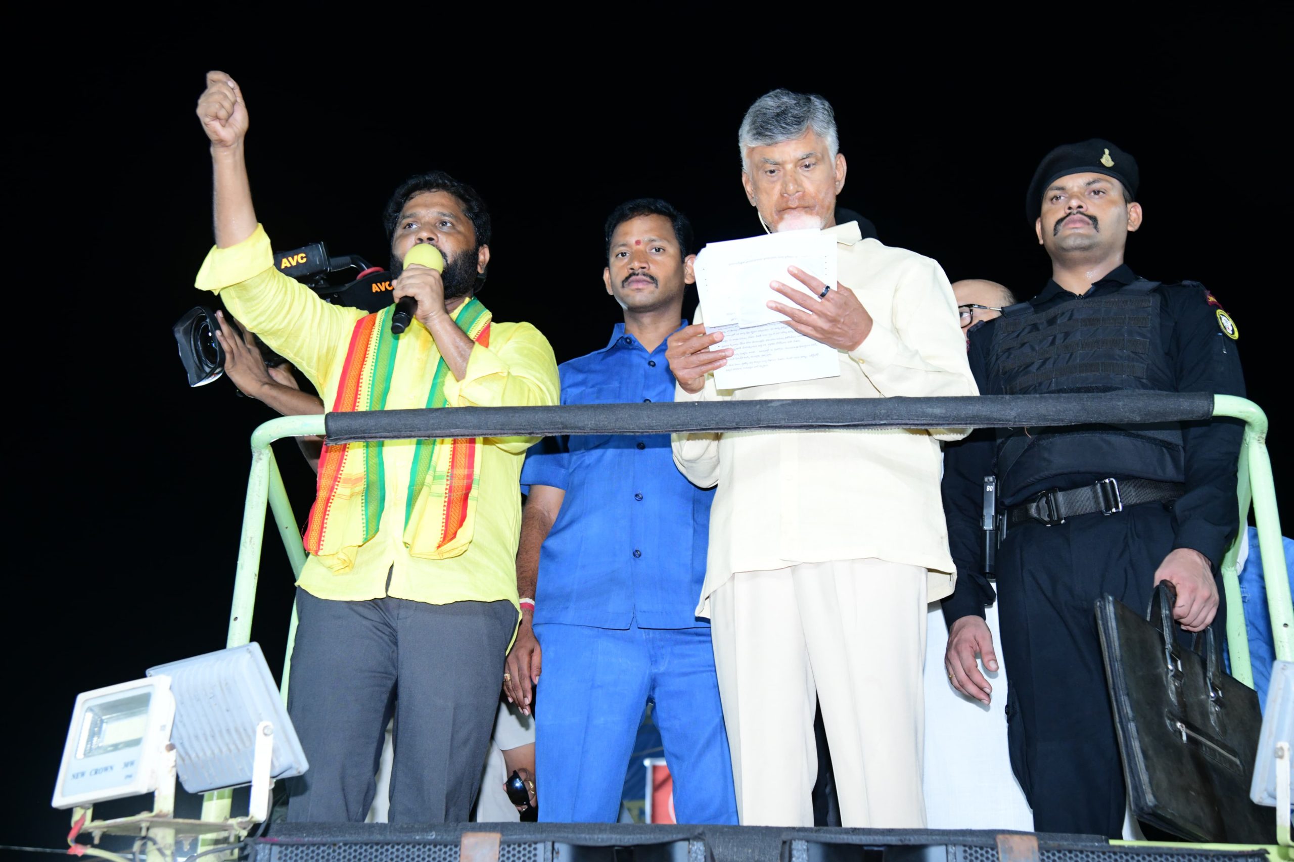 ఎస్సీ కుర్రవాడిని చంపిన ఎమ్మెల్సీని ప్రక్కన పెట్టుకుని ఏం మాట్లాడుతావ్ జగన్రెడ్డి. నిన్న పోలవరంలో అంబేడ్కర్ విగ్రహానికి దండ వేయడానికి వెళ్లిన అనంతబాబును ఎస్సీ యువకులు తరిమి, తరిమి కొట్టారు. నిజానికి తరిమి కొట్టాల్సింది జగన్ రెడ్డిని, పాతిపెట్టాల్సింది వైసీపీని అని చంద్రబాబు ఆగ్రహాన్ని వ్యక్తం చేశారు. జగన్రెడ్డి పాతిపెట్టినా దెయ్యమై తిరిగిరాకుండా కాంక్రీటు వేసి, సీసం వేసి పాతిపెట్టాలని నా తమ్ముళ్లకు పిలుపునిస్తున్నా అన్నారు. విశాఖపట్నంలో డాక్టర్ సుధాకర్ మాస్క్ అడిగిన పాపానికి ఆయన్ను పిచ్చివాడిని చేసే చంపేశారు. సీతానగరంలో ఇసుక దోపిడీని ప్రశ్నంచిన దళిత యువకుడు వరప్రసాద్కు శిరోముండం చేసి అవమానించారు. నా ఎస్సీలంటూ అనేనిత్యం జపం చేసే జగన్రెడ్డి దళిత యువకుడి శిరోముండనాన్ని ఏరోజైనా ఖండిరచాడా? అని ప్రశ్నించారు. అక్కడ ఎన్డీయే అభ్యర్థిని పరిచయం చేస్తూ `వెంకటరాజు బాగా చదువుకున్న అభ్యర్ధి. కంప్యూటర్ విద్య అభ్యసించిన వ్యక్తి. ఒక సాధారణ కుటుంబంలోపుట్టి నేడు రాజకీయాల్లోకి వచ్చాడు. ఆయనకు మీ సంపూర్ణ మద్దతు ఇవ్వాలని కోరుతున్నా అని చంద్రబాబు విజ్ఞప్తి చేశారు.