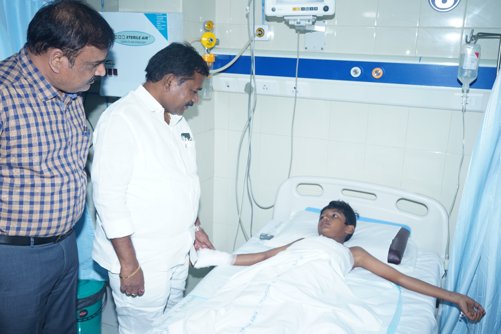 ఒంగోలు (చైతన్యరథం): వేడిపాలు ఒంటిమీద మడటంతో గాయపడి ఒంగోలు కిమ్స్ ఆసుపత్రిలో చికిత్స పొందుతున్న గురుకుల పాఠశాల విద్యార్థిని రాష్ట్ర సాంఘిక సంక్షేమ శాఖ మంత్రి డా.డోలా శ్రీ బాల వీరాంజనేయస్వామి గురువారం నాడు పరామర్శించారు. టంగుటూరు మహాత్మజ్యోతిరావు పూలే గురుకుల పాఠశాలలో 5 తరగతి విద్యార్ధి మధుమోహన్ వేడిపాలు మీద పడి తీవ్రంగా గాయపడ్డాడు. విషయం తెలుసుకున్న మంత్రి అధికారులతో మాట్లాడి విద్యార్థిని ఒంగోలు కిమ్స్ ఆస్పత్రిలో చేర్పించారు. ఆస్పత్రిలో చికిత్స పొందుతున్న విద్యార్థిని మంత్రి డోలా పరామర్శించారు. ఈ సందర్భంగా విద్యార్థి ఆరోగ్య పరిస్థితిని వైద్యులను అడిగి తెలుసుకున్నారు. విద్యార్థి ప్రాణాలకు ఎటువంటి ప్రమాదం లేదని, సీఎంఆర్.ఎఫ్ నిధులతో విద్యార్థికి మెరుగైన వైద్యం అందిస్తామని మంత్రి తెలిపారు. అధికారులు ఇటువంటి ఘటనలు పునరావృతం కాకుండా చూడాలన్నారు. ఈ ఘటనలో సిబ్బంది నిర్లక్ష్యం ఉంటే చర్యలు తప్పవని మంత్రి డోలా హెచ్చరించారు.