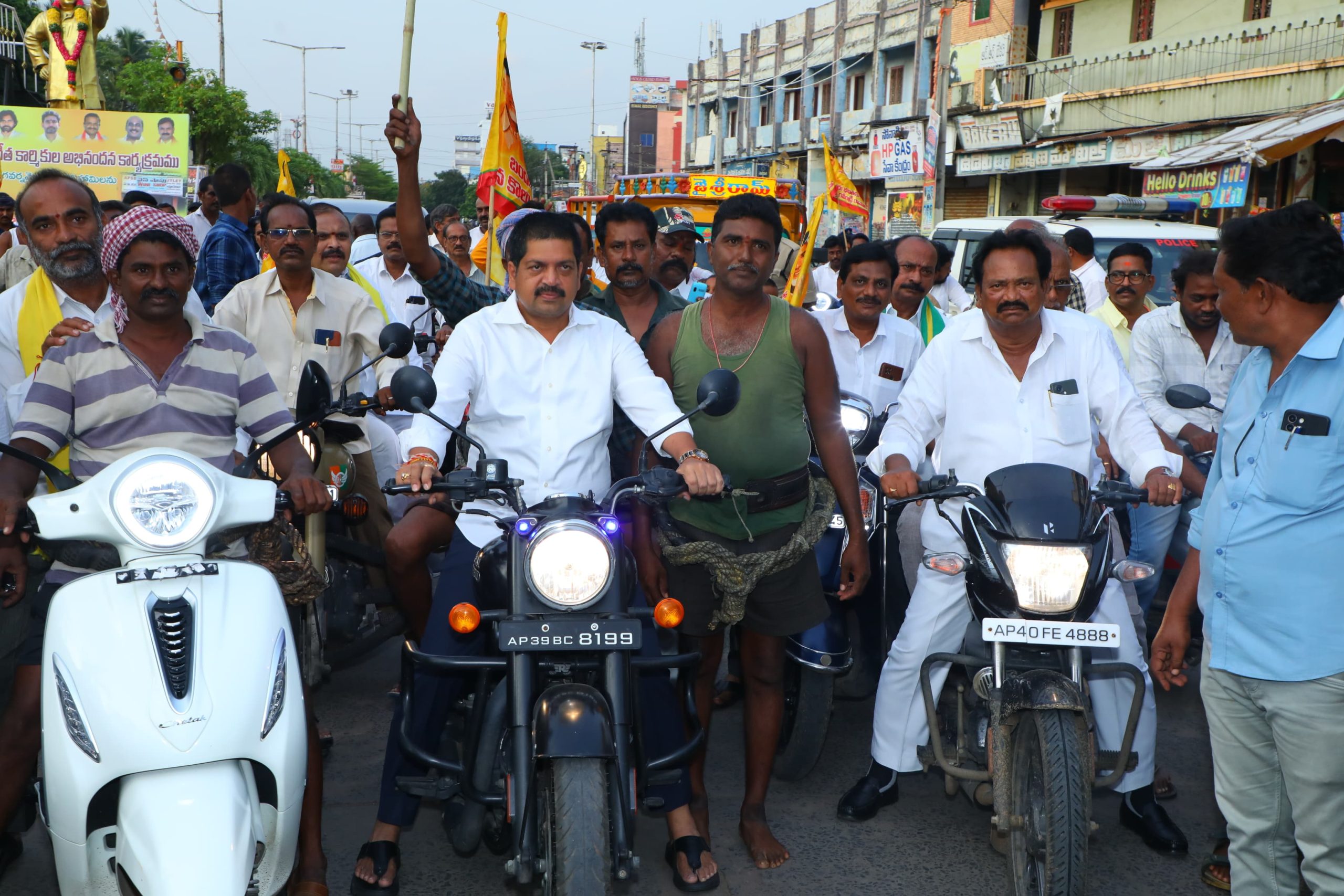 బస్టాండ్‌ వద్ద ఎన్టీఆర్‌ విగ్రహానికి పూలమాల వేసి నివాళుల ర్పించారు. అనంతరం బస్టాండ్‌ సెంటర్‌ నుంచి రుద్రవరం వరకు గీత కార్మికులతో కలిసి బైక్‌ ర్యాలీ నిర్వహించారు. రుద్ర వరంలో తాటి చెట్లకు గీత కార్మికులు పూజలు నిర్వహించారు. అనంతరం ముఖ్యమంత్రి చంద్రబాబు, ఉపముఖ్యమంత్రి పవన్‌ కల్యాణ్‌ చిత్రపటాలకు పాలాభిషేకం నిర్వహించారు. ప్రభుత్వం తీసుకున్న నిర్ణయానికి సంఫీుభావంగా ర్యాలీ నిర్వహిస్తున్నట్లు కార్మికులు పేర్కొన్నారు. ఈ సందర్భంగా మంత్రి కొల్లు రవీంద్ర మాట్లాడుతూ తెలుగుదేశం పార్టీతోనే బీసీల జీవితాల్లో వెలుగు లు సాకారమయ్యాయన్నారు. ఎన్ని కష్టాలు ఎదురైనా బీసీలు తెలుగుదేశం పార్టీ ఆవిర్భావం నుంచి వెన్నంటి నిలిచారని పేర్కొన్నారు.