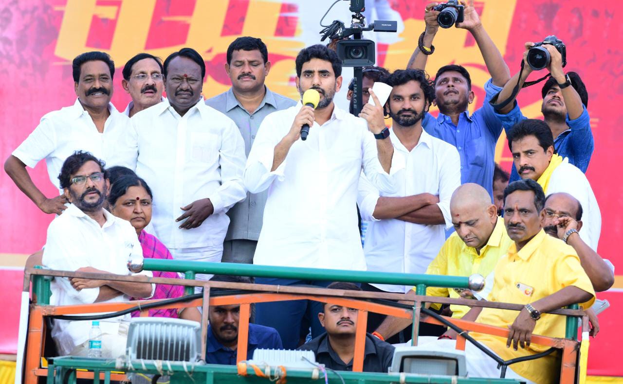 జగన్ యువత భవిష్యత్తు పై దెబ్బకొట్టాడు. జాబ్ క్యాలెండర్ ఇవ్వలేదు, 2.30 లక్షల ఉద్యోగాలు ఇవ్వలేదు, ప్రతి ఏటా 6,500 పోలీసు ఉద్యోగాలు ఇవ్వలేదు, గ్రూప్2 లేదు, డిఎస్సి లేదు. ఉన్న అంబేద్కర్ స్టడీ సర్కిల్స్, బీసీ స్టడీ సర్కిల్స్ మూసేసాడు. జిఓ77 తీసుకొచ్చి ఉన్నత విద్య చదువుతున్న వారికీ ఫీజు రీయింబర్స్మెంట్ పధకం రద్దు చేసాడు. యువగళాన్ని విన్నాం. ప్రభుత్వ, ప్రైవేట్, స్వయం ఉపాధి ద్వారా 5 ఏళ్లలో 20 లక్షల ఉద్యోగాలు కల్పిస్తాం. నిరుద్యోగ యువతకు యువగళం నిధి కింద నెలకు రూ.3000 ఇస్తాం. టిడిపి అధికారంలోకి వచ్చిన వెంటనే ప్రతి ఏడాది నోటిఫికేషన్ ఇస్తాం. అన్ని జిల్లాల్లో స్టడీ సర్కిల్స్ ఏర్పాటు చేస్తాం. జగన్ రైతులు లేని రాజ్యం తెస్తున్నాడు. జగన్ పరిపాలనలో నకిలీ విత్తనాలు, ఎరువులు, పురుగుల మందులతో రైతులు నష్టపోతున్నారు. రైతుల ఆత్మహత్యల్లో ఏపీ నంబర్ 3, కౌలు రైతుల ఆత్మహత్యల్లో నంబర్ 2. రైతుల్ని ఆదుకోకపోగా ఇప్పుడు మీటర్లు పెడుతున్నాడు. మీటర్లు రైతులకు ఉరితాళ్లు. రైతుల బాధలు చూసాం. టిడిపి అధికారంలోకి వచ్చిన వెంటనే అన్నదాతక సుఖీభవ పథకం ద్వారా ఏడాదికి రూ.20 వేలు ఇస్తాం. జగన్ ఉద్యోగస్తులను వేధిస్తున్నాడు. వారంలో సీపీఎస్ రద్దు చేస్తా అని 200 వారాలు దాటినా సీపీఎస్ రద్దు చెయ్యలేదు. జీతం ఒకటో తారీఖున వచ్చే దిక్కు లేదు. ఇప్పుడు జీపీఎస్ అంటూ కొత్త డ్రామా మొదలు పెట్టాడు.