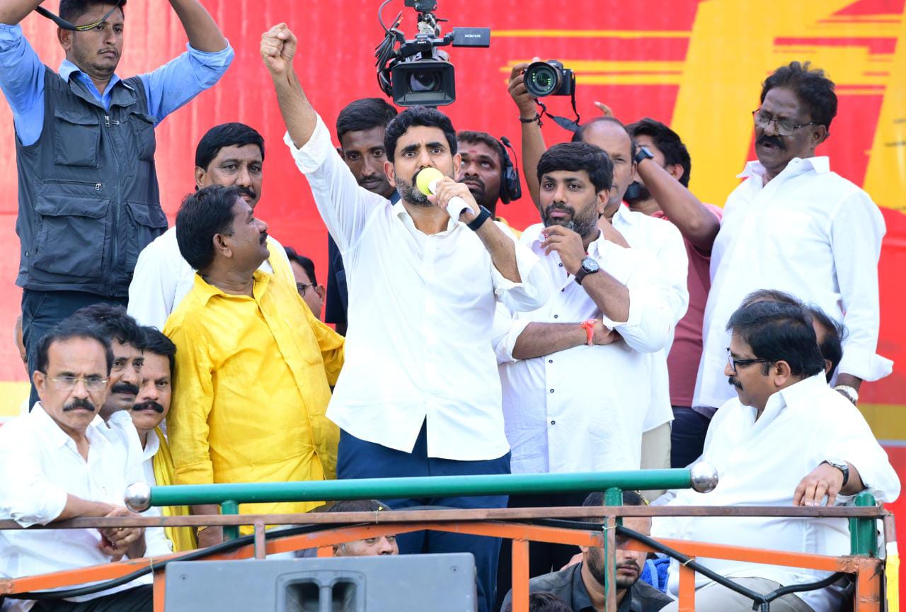యువగళాన్ని విన్నాం. ప్రభుత్వ, ప్రైవేట్, స్వయం ఉపాధి ద్వారా 5 ఏళ్లలో 20 లక్షల ఉద్యోగాలు కల్పిస్తాం. నిరుద్యోగ యువతకు యువగళం నిధి కింద నెలకు రూ.3000 ఇస్తాం. టిడిపి అధికారంలోకి వచ్చిన వెంటనే ప్రతి ఏడాది జాబ్ నోటిఫికేషన్ ఇస్తాం. పెండింగ్ పోస్టులు అన్ని భర్తీ చేస్తాం. అన్ని జిల్లాల్లో స్టడీ సర్కిల్స్ ఏర్పాటు చేస్తాం. డిఎస్సీ కూడా క్రమం తప్పకుండా నిర్వహిస్తాం. జగన్ రైతులు లేని రాజ్యం తెస్తున్నాడు. జగన్ పరిపాలనలో నకిలీ విత్తనాలు, ఎరువులు, పురుగుల మందులతో రైతులు నష్టపోతున్నారు. రైతుల ఆత్మహత్యల్లో ఏపీ నంబర్ 3, కౌలు రైతుల ఆత్మహత్యల్లో నంబర్ 2. రైతుల్ని ఆదుకోకపోగా ఇప్పుడు మోటార్లకు మీటర్లు పెడుతున్నాడు. ఆ మీటర్లు రైతులకు ఉరితాళ్లు. మీటర్లు బిగిస్తే పగలగొట్టండి. టిడిపి మీకు అండగా ఉంటుంది. రైతుల బాధలు చూసాం. టిడిపి అధికారంలోకి వచ్చిన వెంటనే అన్నదాతకు ఏడాదికి రూ.20 వేలు ఇస్తాం. జగన్ ఉద్యోగస్తులను వేధిస్తున్నాడు. వారంలో సీపీఎస్ రద్దు చేస్తా అని 200 వారాలు దాటినా సీపీఎస్ రద్దు చెయ్యలేదు. ఇప్పుడు జిపిఎస్ అంటూ కొత్త డ్రామా మొదలు పెట్టాడు. పోలీసులకు 4 సరెండర్స్, 8 టిఎ, డీఏలు పెండింగ్ పెట్టాడు. ఆఖరికి జిపిఎఫ్ డబ్బులు కూడా లేపేశారు. మెడికల్ బిల్లులు కూడా ఇవ్వడం లేదు. పోలీసులు దాచుకున్న జిపిఎఫ్ డబ్బు సైతం కొట్టేసాడు. నేను ప్రతి రోజూ మాట్లాడుతుంటే భయపడి కొంత బకాయి తీర్చాడు. ఇంకా రావాల్సింది చాలా ఉంది.ఆఖరికి పెన్షనర్లకు పెన్షన్ ఇవ్వలేని దివాలాకోరు ప్రభుత్వం ఇది. బీసీలు పడుతున్న కష్టాలు నేను నేరుగా చూసాను. సైకోపాలనలో 26 వేల బిసిలపై అక్రమ కేసులు, నిధులు, కుర్చీలు లేని కార్పొరేషన్లు.