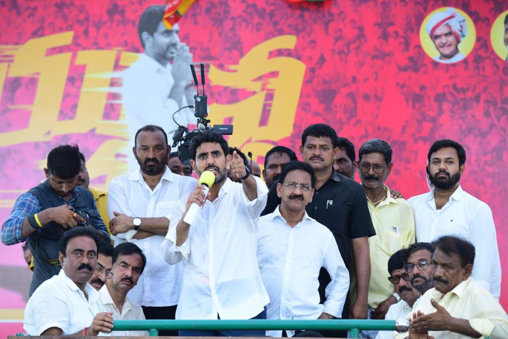 జాబ్ క్యాలెండర్ ఇవ్వలేదు, 2.30 లక్షల ఉద్యోగాలు ఇవ్వలేదు, ప్రతి ఏటా 6,500 పోలీసు ఉద్యోగాలు ఇవ్వలేదు, గ్రూప్2 లేదు, డిఎస్సి లేదు. ఉన్న అంబేద్కర్ స్టడీ సర్కిల్స్, బీసీ స్టడీ సర్కిల్స్ మూసేసాడు. జిఓ77 తీసుకొచ్చి ఉన్నత విద్య చదువుతున్న వారికీ ఫీజు రీయింబర్స్మెంట్ పధకం రద్దు చేసాడు. యువగళాన్ని విన్నాం. ప్రభుత్వ, ప్రైవేట్, స్వయం ఉపాధి ద్వారా 5 ఏళ్లలో 20 లక్షల ఉద్యోగాలు కల్పిస్తాం. నిరుద్యోగ యువతకు యువగళం నిధి కింద నెలకు రూ.3000 ఇస్తాం. టిడిపి అధికారంలోకి వచ్చిన వెంటనే ప్రతి ఏడాది జాబ్ నోటిఫికేషన్ ఇస్తాం. పెండింగ్ పోస్టులు అన్ని భర్తీ చేస్తాం. అన్ని జిల్లాల్లో స్టడీ సర్కిల్స్ ఏర్పాటు చేస్తాం. జగన్ రైతులు లేని రాజ్యం తెస్తున్నాడు. జగన్ పరిపాలనలో నకిలీ విత్తనాలు, ఎరువులు, పురుగుల మందులతో రైతులు నష్టపోతున్నారు. రైతుల ఆత్మహత్యల్లో ఏపీ నంబర్ 3, కౌలు రైతుల ఆత్మహత్యల్లో నంబర్ 2. రైతుల్ని ఆదుకోకపోగా ఇప్పుడు మోటార్లకు మీటర్లు పెడుతున్నాడు. ఆ మీటర్లు రైతులకు ఉరితాళ్లు. మీటర్లు బిగిస్తే పగలగొట్టండి. టిడిపి మీకు అండగా ఉంటుంది.