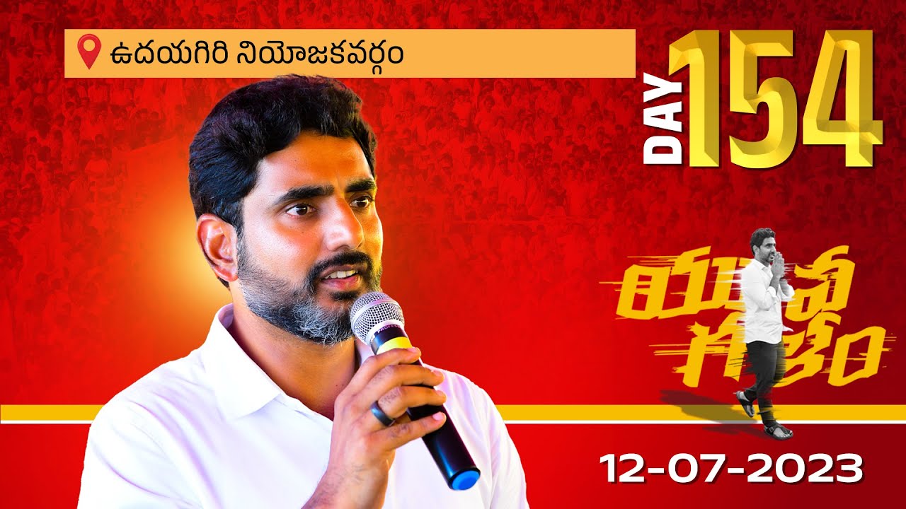 <strong>LIVE : Day-154: ఉదయగిరి అసెంబ్లీ నియోజకవర్గంలో యువగళం సారధి నారా లోకేష్ యువగళం పాదయాత్ర.</strong> [embed]https://www.youtube.com/watch?v=FOPt80PQyJI[/embed]