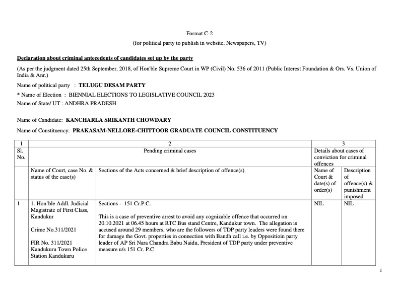అమరావతి: ఆంధ్రప్రదేశ్ రాష్ట్రంలో పట్టభద్రుల ఎమ్మెల్సీ ఎన్నికల్లో తెలుగుదేశం తరపున పోటీ చేస్తున్న కంచర్ల శ్రీకాంత్ అఫిడవిట్ వివరాలు..