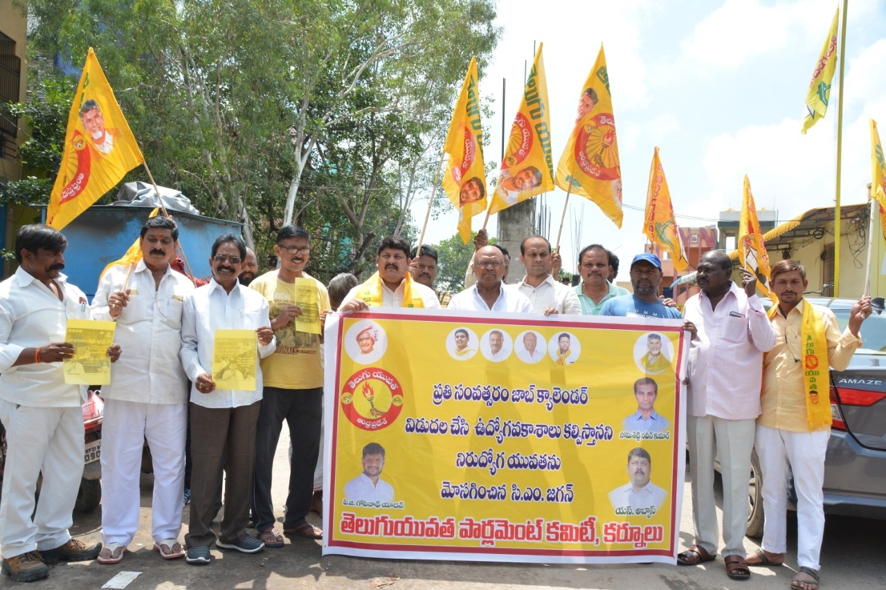 కర్నూలు: జాబ్ క్యాలెండర్ పేరుతో నిరుద్యోగులను జగన్ రెడ్డి నిలువునా మోసం చేశాడని నిరసిస్తూ కర్నూలు పార్లమెంట్ తెలుగుయువత కమిటీ ఆధ్వర్యంలో జిల్లా తెలుగుదేశం పార్టీ కార్యాలయం దగ్గర టీడీపీ నేతలు నిరసన చేపట్టారు. రాష్ట్రంలో ఉద్యోగాలు లేక రిక్షా తొక్కే పరిస్థితి నెలకొందని విమర్శించారు. ఈ కార్యక్రమానికి కర్నూలు పార్లమెంట్ పార్టీ అధ్యక్షులు సోమిశెట్టి వెంకటేశ్వర్లు, కర్నూలు పార్లమెంట్ యువత అధ్యక్షులు యస్.అబ్బాస్, రాష్ట్ర యువత ఉపాధ్యక్షులు, కర్నూలు పార్లమెంట్ ఇంచార్జి పన్నర్సు వెంకటప్ప, రాష్ట్ర యువత ఉపాధ్యక్షులు సోమిశెట్టి నవీన్ కుమార్, తెలుగుయువత రాష్ట్ర యువత ఉపాధ్యక్షులు సురేష్ నాఉడు, సూరి (ఆలూరు), రాజా సాబ్ (ఆలూరు), షేక్ జహంగీర్, పార్లమెంత్ కార్యదర్శి ఎం.చరణ్ కుమార్, సి.సతీష్ నాయుడు, జె.క్రిష్ణ కాంత్, పి.గొట్టయ్య, కె.నాగరాజు, ఎస్.లింగేష్, కె.శ్రీ రాం మొదలగు వారు పాల్గొన్నారు.