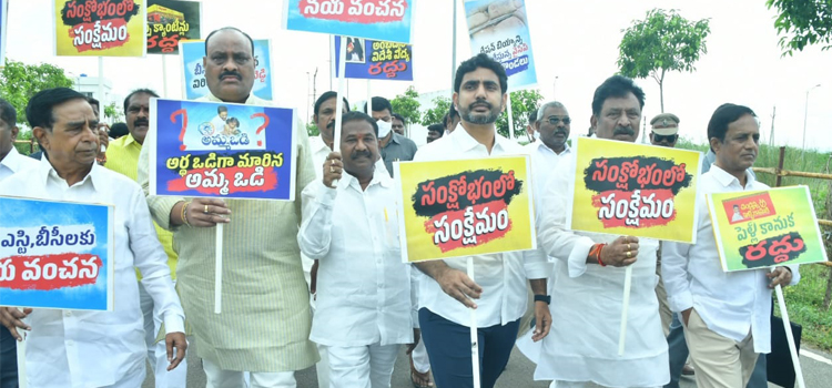 అమరావతి: రాష్ట్ర శాసనసభ సమావేశాల్లో వరుసగా నాలుగోరోజు కూడా తెలుగుదేశం శాసనసభ్యులను అధికారపక్షం గొంతునొక్కింది. సంక్షోభంలో సం క్షేమం పేరుతో టిడిపి ప్రవేశపెట్టిన వాయిదాతీర్మానా న్ని తిరస్కరించిన స్పీకర్… నిరసన తెలుపుతున్న సభ్యులను నాలుగోరోజు కూడా సస్పెండ్ చేశారు. అంతకుముందు సంక్షోభంలో సంక్షేమం నినాదంతో నారా లోకేష్ ఆధ్వర్యంలో టిడిపి శాసనసభ పక్షం ఆధ్వర్యంలో నిరసన తెలిపారు. వివిధ సంక్షేమ పథకా ల రద్దునిరసిస్తూ అసెంబ్లీ సమీపంలోని ట్రాఫిక్ పీఎస్ వద్ద తెలుగుదేశం ఎమ్మెల్యేలు, ఎమ్మెల్సీలు నిరసన చేపట్టారు. అన్న క్యాంటీన్లు,పెళ్లి కానుక, పండుగ కానుకలు, అంబేద్కర్ విదేశీ విద్యపథకాలు రద్దు నిర సిస్తూ ప్రదర్శన చేశారు. సబ్ ప్లాన్ నిధులు పక్కదారి, అమ్మ ఒడి కుదింపు, డ్వాక్రా కి టోకరా, కరెంట్ బిల్లుల ఆధారంగా ఫించన్ కోత తదితర అంశాలపై ఆం దోళన చేపట్టారు. రేషన్ బియ్యం కుంభకోణం, ఎస్సి, ఎస్టి, బీసీలకు నయ వంచన నినాదాలతో నిరసన తెలుపుతూ కాలినడకన అసెంబ్లీకి వెళ్లారు.