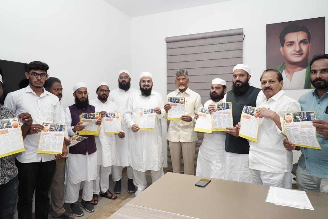 అమరావతి రాజధానితోనే ముస్లింల సంక్షేమం, భవిష్యత్ ఆధారపడి ఉంటుందని, సార్వత్రిక ఎన్నికల్లో ఓటు రూపంలో వచ్చిన అవకాశాన్ని ప్రతి ముస్లిం సోదరుడు సద్వినియోగం చేసుకుని తెలుగుదేశం పార్టీ అభ్యర్థులను గెలిపించాలని ఏపీ ఉలేమా ఆర్గనైజేషన్ నిర్వాహకులు, మౌలానా నయీం ఉర్ రెహ్మాన్ ఖాన్ రషాద్మి, ఆంధ్ర, తెలంగాణ జమియత్ ఉలేమ్మా ఎ హింద్, ముస్లిం మైనారిటీ సంఘాల ఐక్య కార్యాచరణ సమితి నాయకులు తెలిపారు. బుధవారం నాడు తెలుగుదేశంపార్టీ జాతీయ అధ్యక్షుడు నారా చంద్రబాబునాయుడు సమక్షంలో ‘అమరావతితోనే ముడిపడి ఉన్న ముస్లింల భవిష్యత్తు’ అనే కరపత్రాన్ని, మైనారిటీలపై జగన్ నిజస్వరూపం, వాస్తవాలు అంటూ.. ఇచ్చింది నవరత్నాలు కాదు నవమోసాలు అంటూ మరో కరపత్రాన్ని ఆవిష్కరించారు. ఈ సందర్భంగా ఏర్పాటు చేసిన సమావేశంలో ఏపీ ఉలేమా ఆర్గనైజేషన్ నిర్వాహకులు మౌలానా నయీం ఉర్ రెహ్మాన్ ఖాన్ రషాద్మి మాట్లాడుతూ.. రాష్ట్రంలోని ముస్లింలకు జగన్ నిజ స్వరూపాన్ని, ప్రజా రాజధాని అమరావతి ఆవశ్యకతను తెలియజేయాల్సిన బాధ్యత ముస్లిం మతపెద్దలపై ఉందన్నారు. రాష్ట్రంలో సుఖసంతోషాలు, శాంతిభద్రతలు, చదువుకున్న యువతకు ఉపాధి అవకాశాలు, వ్యాపారులకు వాణిజ్య వసతులు, చేతివృత్తుల వారికి చేతినిండా పని లభించాలంటే మన రాష్ట్ర ముఖ్యమంత్రిగా చంద్రబాబునాయుడు గారిని గెలిపించుకోవాల్సిన ఆవశ్యకత ఉందని తెలిపారు. శుక్రవారం ప్రత్యేక ప్రార్థనల అనంతరం రాష్ట్రంలో ఉన్న ప్రతి మసీదు వద్ద ఈ రెండు కరపత్రాలు పంచాలని ముస్లిం మత పెద్దలు నిర్ణయించారు.