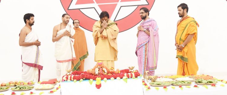 మంగళగిరి: వారాహి దీక్షలలో ఉన్న ఉప ముఖ్యమంత్రి పవన్కళ్యాణ్ సమాజ క్షేమాన్ని, దేశ సౌభాగ్యాన్ని ఆకాంక్షిస్తూ సూర్యారాధన ఆచరిస్తున్నారు. మంగళగిరి పార్టీ కేంద్ర కార్యాలయంలో గురువారం పూజాధికాలు నిర్వహించారు. దీక్షాబద్ధులైన ఆయన ఆదిత్య యంత్రం ఎదుట ఆశీనులై వేద పండితుల మంత్రోచ్ఛారణల నడుమ ప్రత్యక్ష భగవానుడిని ఆరాధించి సూర్య నమస్కారం చేశారు. పవన్ గతంలో నిత్యం సూర్య నమస్కారాలు చేసేవారు. వెన్ను సంబంధిత కారణాలతో కొద్దికాలంగా సూర్య నమస్కారాలు చేయడం సాధ్యం కావడం లేదు. అందుకు ప్రతిగా సూర్య నమస్కారాలకు సంబంధించి మంత్రసహిత ఆరాధనను నిర్వర్తించారు. విజ్ఞానాభివృద్ధి, సుఖ సంతోషాలు, క్షేమానికి ప్రత్యక్ష భగవానుడైన సూర్య భగవానుడిని ఆరాధించడం భారతీయ సంస్కృతిలో భాగం. ఆరోగ్యానికి సూర్యారాధన ఎంతో అవసరమని చెబుతూ ‘ఆరోగ్యం భాస్కరాదిచ్చేత్’ అనే సూక్తిని ఆయుర్వేద నిపుణులు ప్రస్తావిస్తారు.